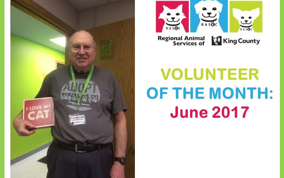 Meet David! David Howerton has impressed so many RASKC staff, volunteers, and customers with his amazing dedication and gentle disposition. While a great many RASKC volunteers are extraordinarily dedicated, not many can match the number of hours and shifts that David has contributed in a relatively brief period of time. From the time that he started seven months ago as a Cat Meet and Greet volunteer, he has worked more than 412 hours over 190 shifts. While this includes the time he has contributed with RASKC pet visits to a local retirement home, it does not include additional foster hours that he has given. Simply amazing. Not only is David extremely generous with his time, his affable and helpful nature makes everyone want to spend more time with him. Thank you, David!