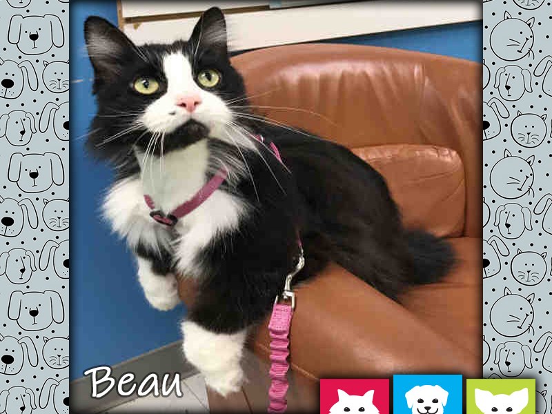 And don’t let anyone tell you that you can’t take a cat for a walk! Beau is learning to walk on a cat harness and leash. Our volunteers take him for strolls around the cat adoption area, and he is getting used to exploring on the harness. While Beau has lived in a home with other cats and dogs, as well as children, he can be a bit shy and would do best in a calm and quiet home.