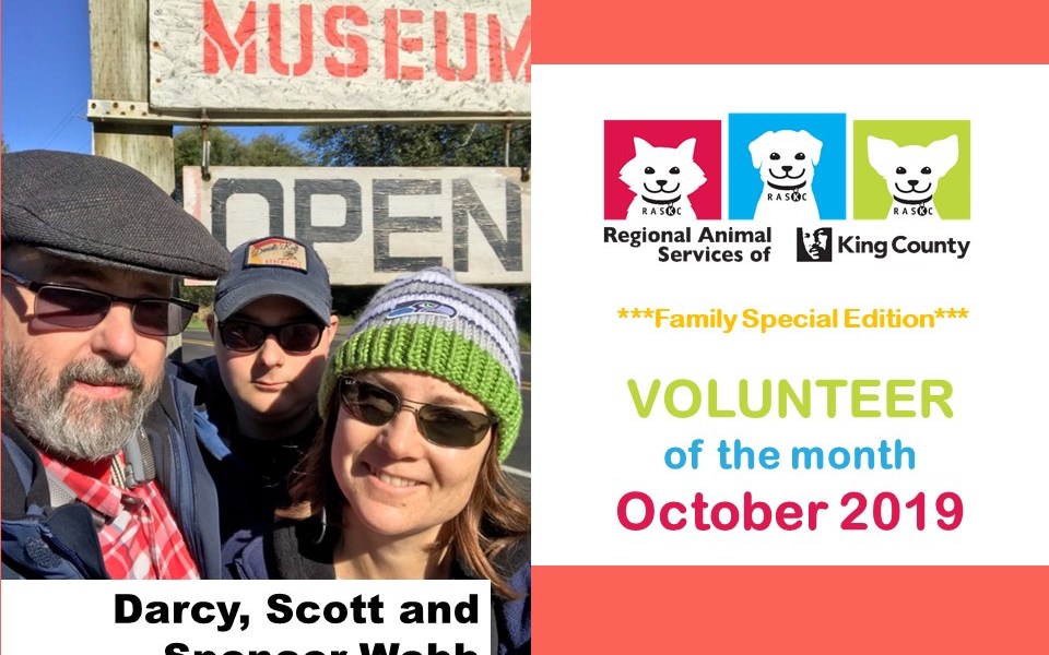 Meet the Webb family! With tremendous joy RASKC honors the Webb family- parents Darcy and Scott with son Spencer. They are among RASKC’s longest serving and most delightful volunteers. The Webb family has been fostering RASKC cats every year for at least 11 consecutive years. They also had volunteered on weekly shifts for several years when we maintained a cat-adoption program at Federal Way PetSmart. We are so glad that the Webb family is an integral part of RASKC’s feline pride.