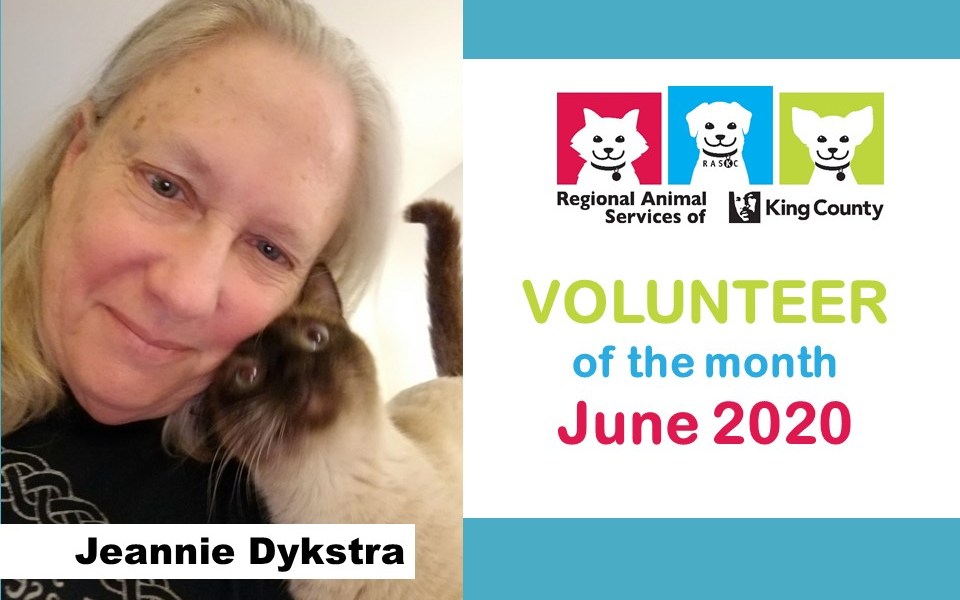 Meet Jeannie! RASKC is super happy to honor Jeannie Dykstra as Volunteer of the Month. In only two years, she has contributed nearly 2,600 hours- as a foster volunteer extraordinaire and also by contributing weekly shifts in RASKC’s Vet Clinic and on RASKC’s Covington Cat-Care Team. Jeannie has also trained quite a number of new volunteers. She brings an outstanding background to volunteering, as you will see below.