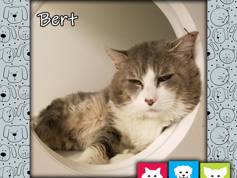 This young gray and white tabby was brought in by a Good Samaritan in June. He has a “Bashful Blue” personality, meaning he may get nervous in new situations. Bert would like a family who understands that he might need some time to warm up, but after that he will be a very devoted friend!