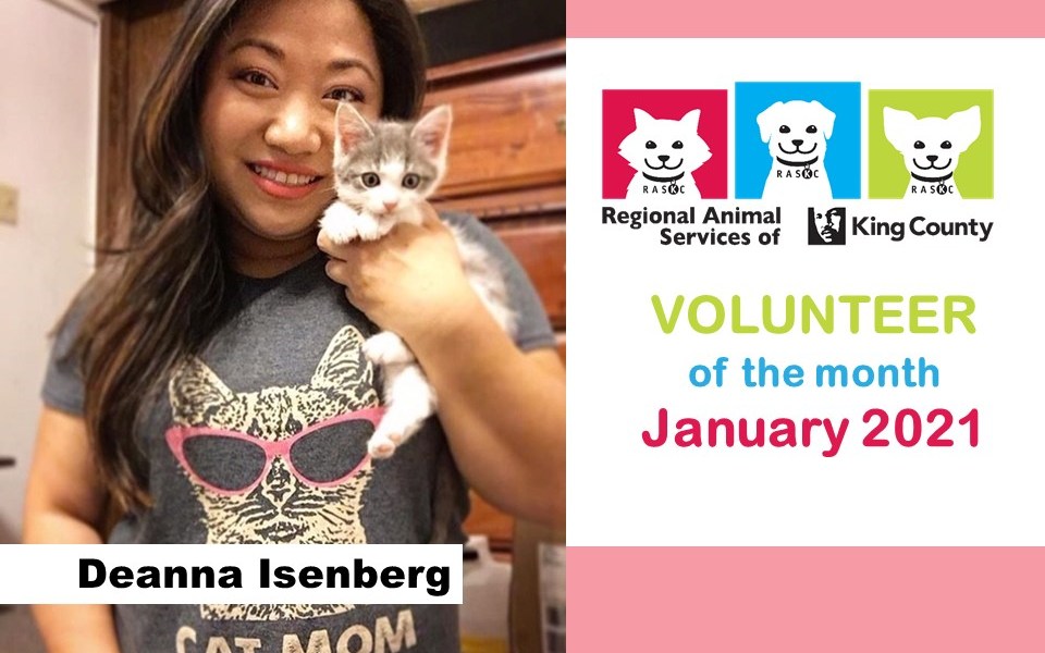 A: Regional Animal Services has always been something I’ve known about since I grew up in the Auburn/Kent area. Even before I was a volunteer with RASKC, I had to call the shelter for help dealing with a stray/injured animal I found.