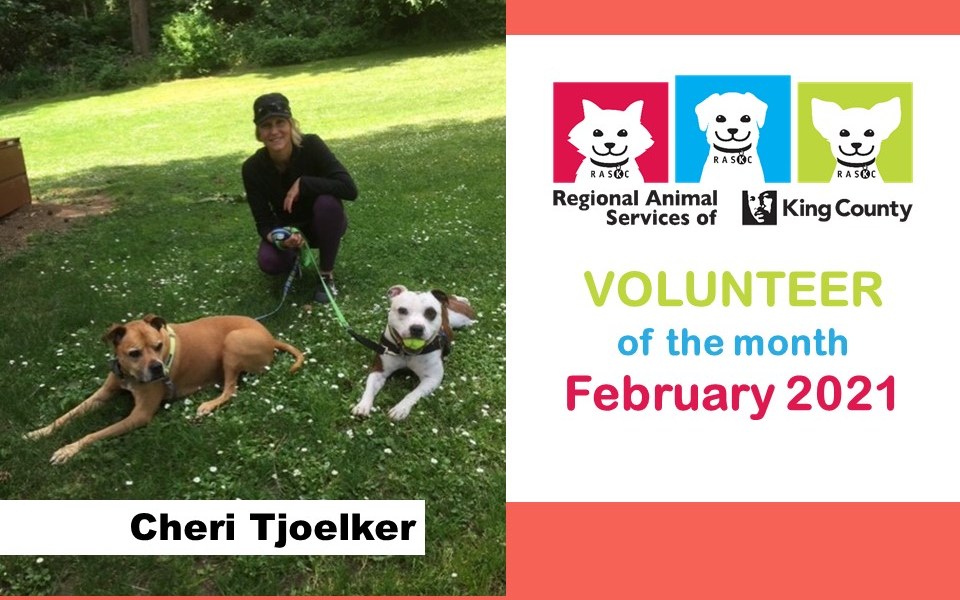 Meet Cheri! With tremendous pleasure RASKC names Cheri Tjoelker as Volunteer of the Month. In 2019 she contributed the most hours among Dog Walkers- more than twice as much as the person who gave the second-highest number of hours. In pre-COVID times, Cheri faithfully worked weekly Dog Walking and dog Reiki shifts. She also served on our Dog Modification Team and as a RASKC classroom instructor, mentor, and Dog Team Skills Assessor. RASKC will always feel grateful for the many off-campus adventures that Cheri and volunteer Jennifer Jewell have taken dogs on, especially the extra support they provided to dog Charlie to help his foster stay be so successful. Additionally Cheri started at RASKC as a Shelter Helper and helped in previous years with our giftwrapping fundraiser.