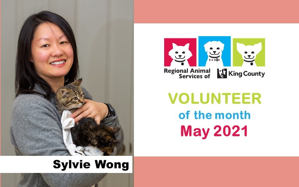Meet Sylvie! RASKC is very honored to recognize Sylvie Wong as Volunteer of the Month. She is one of RASKC’s top foster volunteers. “Sylvie is one that is so dedicated,” said Foster Care Coordinator Lori Mason. “She rarely needs my help, but she continues to dedicate her love and home to kittens. It doesn’t matter if the kittens are sick, Sylvie will always step forward to help.” Having started in 2015, Sylvie has contributed over 4,200 hours- both with fostering and having served on RASKC’s Kirkland Cat-Care Team with her daughter. Thank you, Sylvie!
