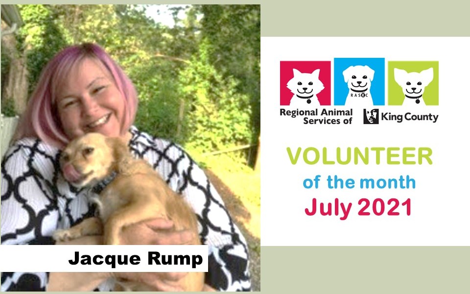 Meet Jacque! RASKC is very honored to name Jacque Rump as Volunteer of the Month. In 2018 she contributed more foster hours than any other RASKC volunteer. Only one other volunteer contributed more foster hours than Jacque last year– Jacque contributed 3,769 hours then. Altogether, she has contributed more than 10,400 foster hours so far! We deeply appreciate Jacque’s skill, experience, and dedication. And she’s delightful to work with too. Thank you, Jacque!