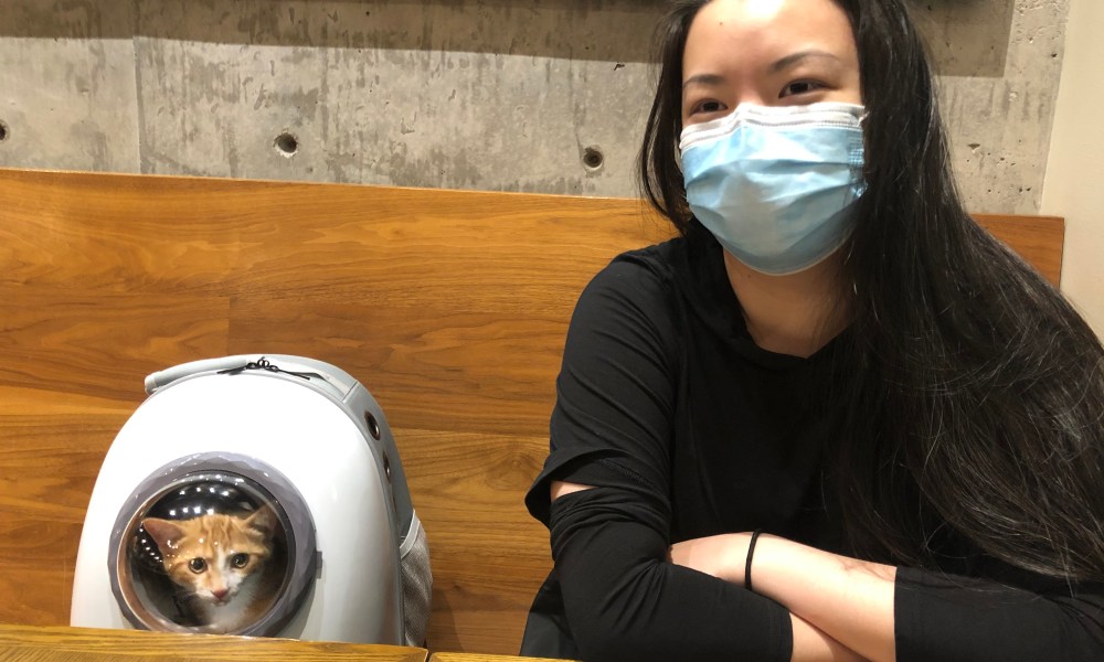 “I like to joke that my kitties take after me — they’re quirky and highly food-motivated like me, hehe. They’re both around one year old. They enjoy lounging and birdwatching on my balcony, going for walks on their harnesses, and taking road trips in the car. They’re quite different in looks and personality from each other. “Tiny” aka “Banshee” is a petite, longhaired smoky tortie with a curious peach stripe on her face. In early summer 2020, Tiny came to me along with her five littermates and mama cat when she was just three days old. Tiny was just so tiny but strong, and she could fight through her siblings and make her mark. She’s smart and inquisitive and very sweet. I think she was the first or second to figure out litter box training. I loved her personality and her striking looks that just kept evolving, so I think I suspected early on that she had the potential to be a foster failure.