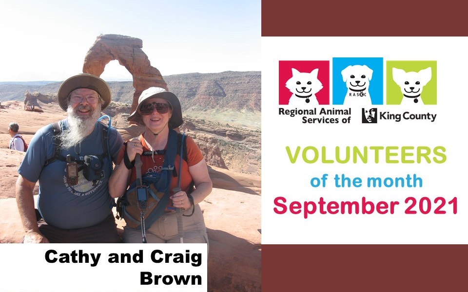 Meet Cathy and Craig! RASKC is profoundly pleased to honor Craig and Cathy Brown as Volunteers of the Month. They are among RASKC’s top foster volunteers. Foster Care Coordinator Lori Mason said, “I love them!” Since they began in 2012, Cathy and Craig have contributed more than 6,600 hours, mainly fostering- also with animal transports and previously with RASKC’s former program Mission Reunite: Help & Hope for Lost Pets. Their dedication is astounding, and their consistently cheerful attitudes are very infectious. Thank you, Craig and Cathy!
