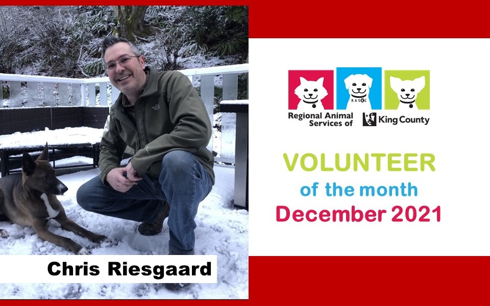 Meet Chris! RASKC is extremely happy to honor Chris Riesgaard as Volunteer of the Month for December 2021. Of the regularly scheduled Dog Walkers at the Pet Adoption Center now, he is the longest serving – he’s been doing it since 2012! Rated top level “red,” Chris mentored quite a number of new volunteers in pre-pandemic days. Super skilled, dedicated, and great to work with, RASKC feels very fortunate to count Chris among our top volunteers.