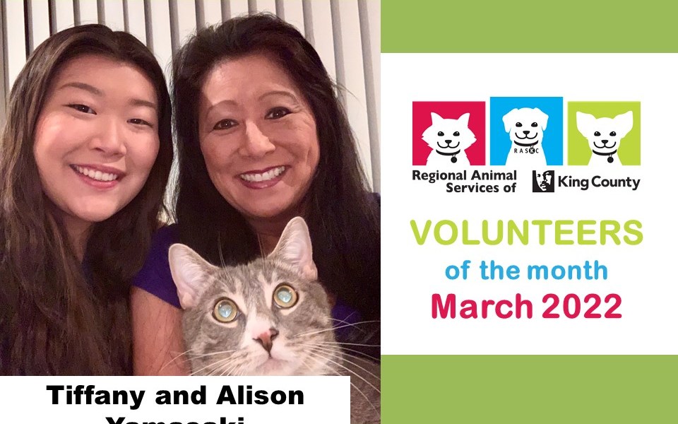 Meet Tiffany and Alison! RASKC is profoundly pleased to honor this mother/daughter duo as our Volunteers of the Month. Tiffany and Alison Yamasaki have fostered almost 50 kittens total over the past dozen years, including each year of the pandemic. They are wonderful to work with! Foster Care Coordinator Lori Mason says, “I am so grateful to Alison and Tiffany. I love Alison’s enthusiasm and willingness to help. And she has a fabulous smile.” Thank you, Alison and Tiffany!