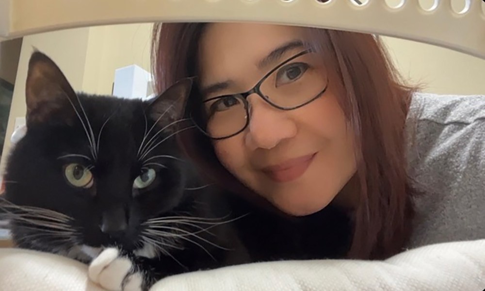 “I have a four-year-old rescue tuxedo cat. I smother him with kisses. He is a daddy’s boy, and they love taking naps together. Boogie is a goofball and loves making ‘sin biscuits.’