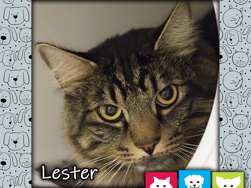 This young brown tabby came to us in early August because his previous owners were no longer able to care for him. Lester lived with another cat, and his previous owners described Lester as shy, loving, cuddly, and playful. Because of his shy nature, Lester is one of our “Bashful Blue” personality pets.