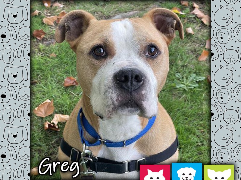 This tan and white pittie boy was brought in by a good Samaritan in mid-September. At almost 60 pounds, Greg is considered a large breed dog.