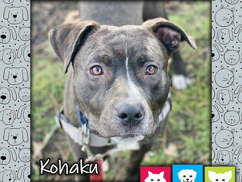 This young male pittie was brought in by an animal control officer in early January. At about 57 pounds, Kohaku is considered a medium breed dog.