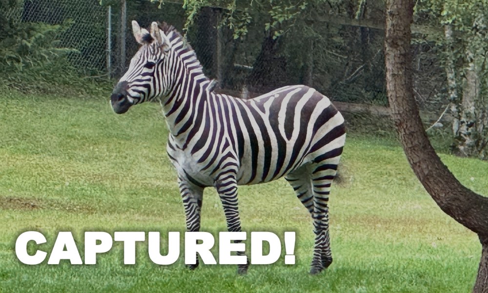 “Sugar,” also known as “Shug,” was rescued in the Riverbend area southeast of the city of North Bend, Washington just after 7 p.m. Friday. She had been on the run for nearly six days in the foothills of the Cascade Mountains after escaping from a trailer on Sunday. Shug and three other zebras were being transported to their new home when an apparent problem with the trailer they were being hauled in forced the owner to pull off Interstate 90 at North Bend. When the owner checked the trailer, the zebras bolted. Three of the zebras were quickly rounded up and continued on their way to Montana, but Shug evaded rescuers until Friday.