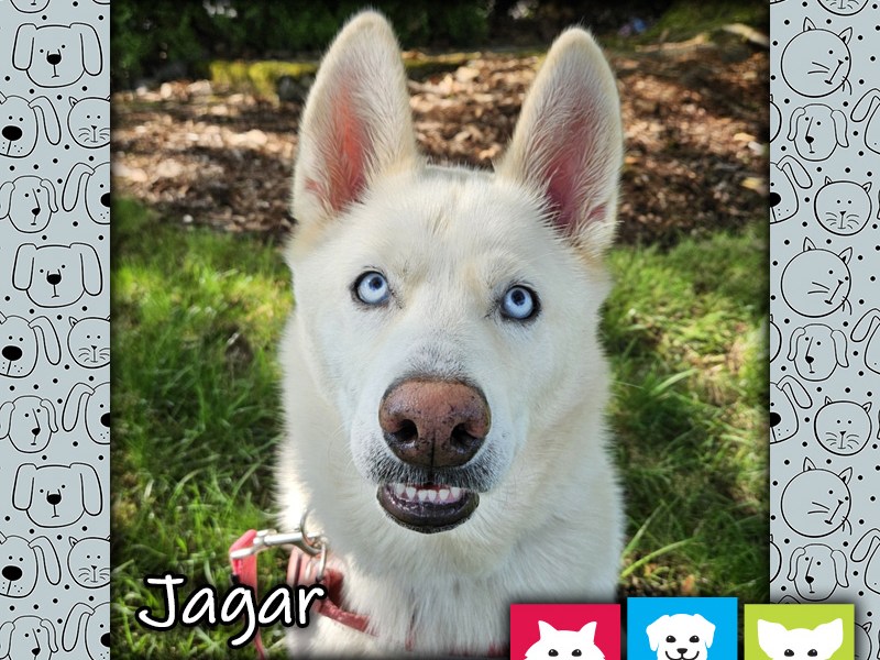 Jagar is an affectionate lovebug, but likes to give it at his own pace. He’ll let you know by poking you with his nose. Like most Huskies, Jagar has an independent streak and likes to do his own thing. Huskies are also known for having temper tantrums – including loud howls – when they don’t get their way. His new family will need to be familiar with his breed characteristics.