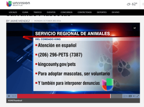 This is the first of nine segments which Univision Seattle, KUNS Channel 51, is proudly airing on Wednesdays at 6pm and 11pm. This segment is general introduction on the services that RASKC provides in order to save pets. Click on the link below to watch the video. Learn more about RASKC’s stories on Univision.