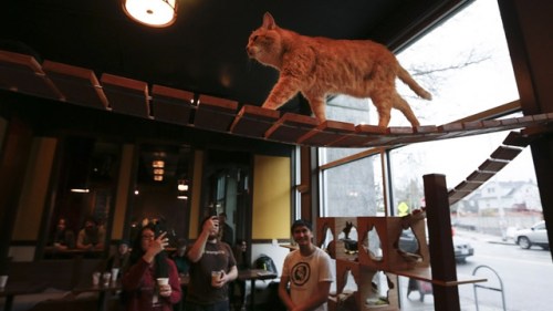 And, no, you can’t just walk out with one. The cafe hosts cats from Regional Animal Services of King County that are available for adoption only on certain days.